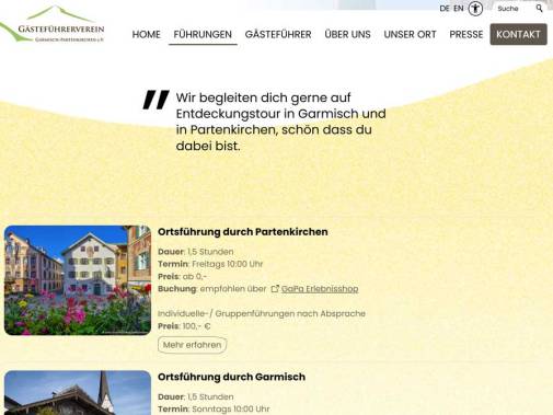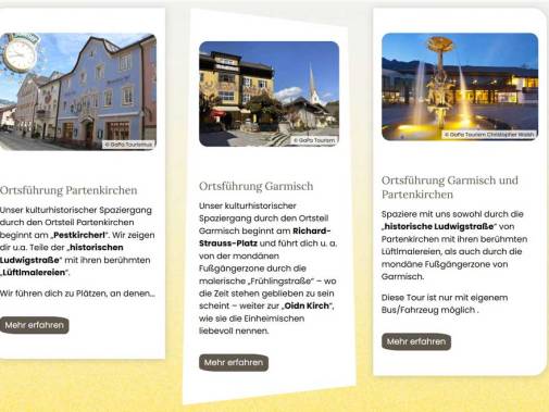 Die Website des Gästeführervereins Garmisch-Partenkirchen präsentiert ein vielfältiges Angebot an geführten Touren durch die Region – von Spaziergängen durch die historische Ludwigstraße mit ihren berühmten Lüftlmalereien bis hin zu Wanderungen im Classic-Gebiet und Ausflügen zu Sehenswürdigkeiten wie Schloss Neuschwanstein. Die Führungen verbinden Naturerlebnis mit kulturellem Wissen und geben Einblicke in das gelebte Brauchtum und die Geschichte der Region.